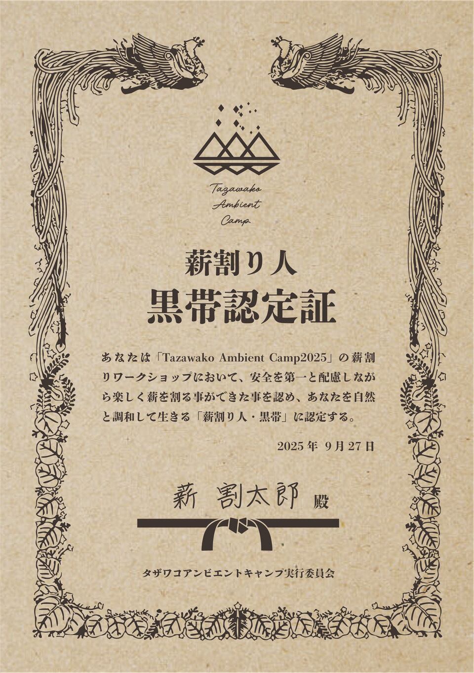 □薪割り道場 認定書を授与