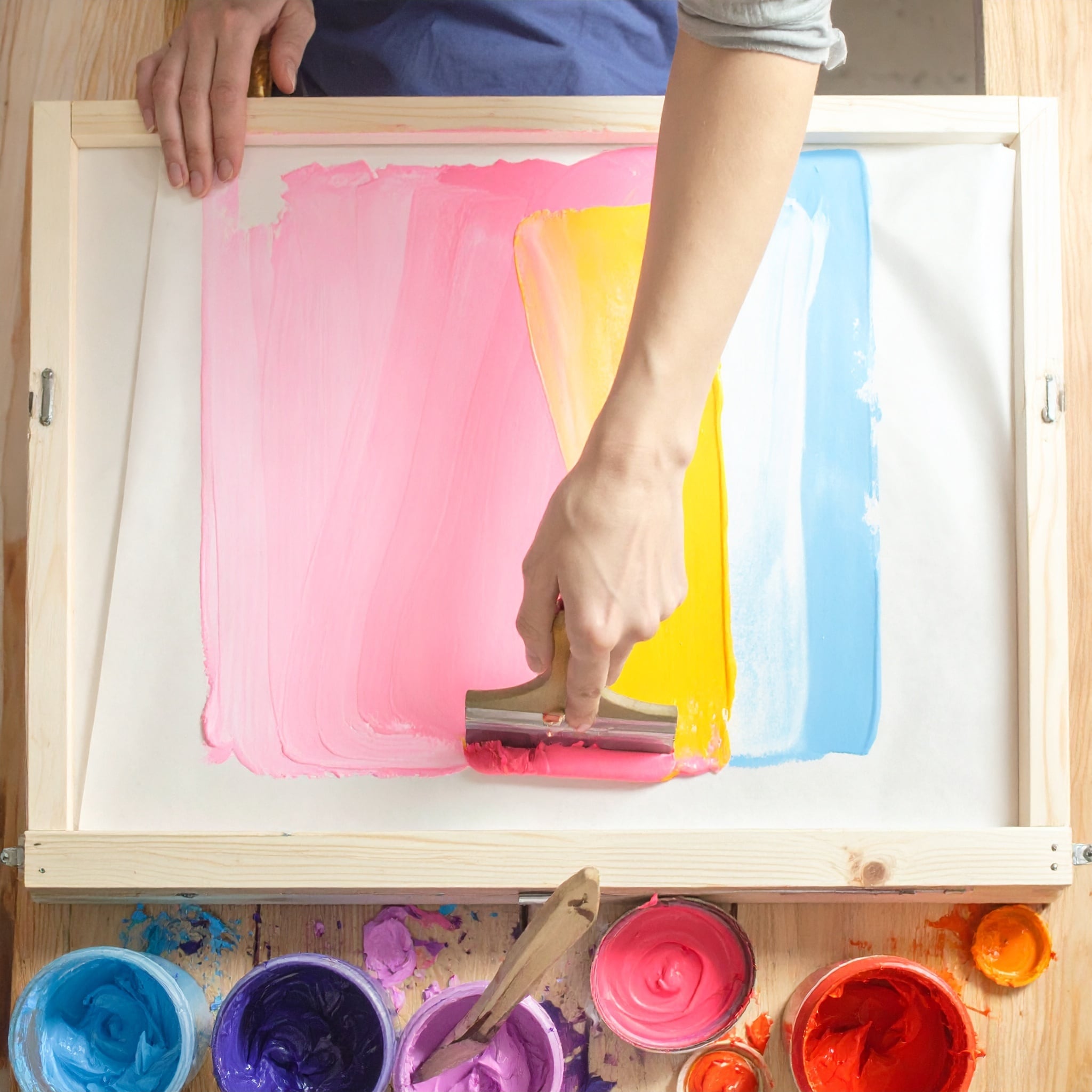 通常は単色で印刷されるシルクスクリーン印刷をあえて様々な色を散りばめて擦り上げます。作品の特性上、写真とは異なる商品が届きますことをご理解ください。